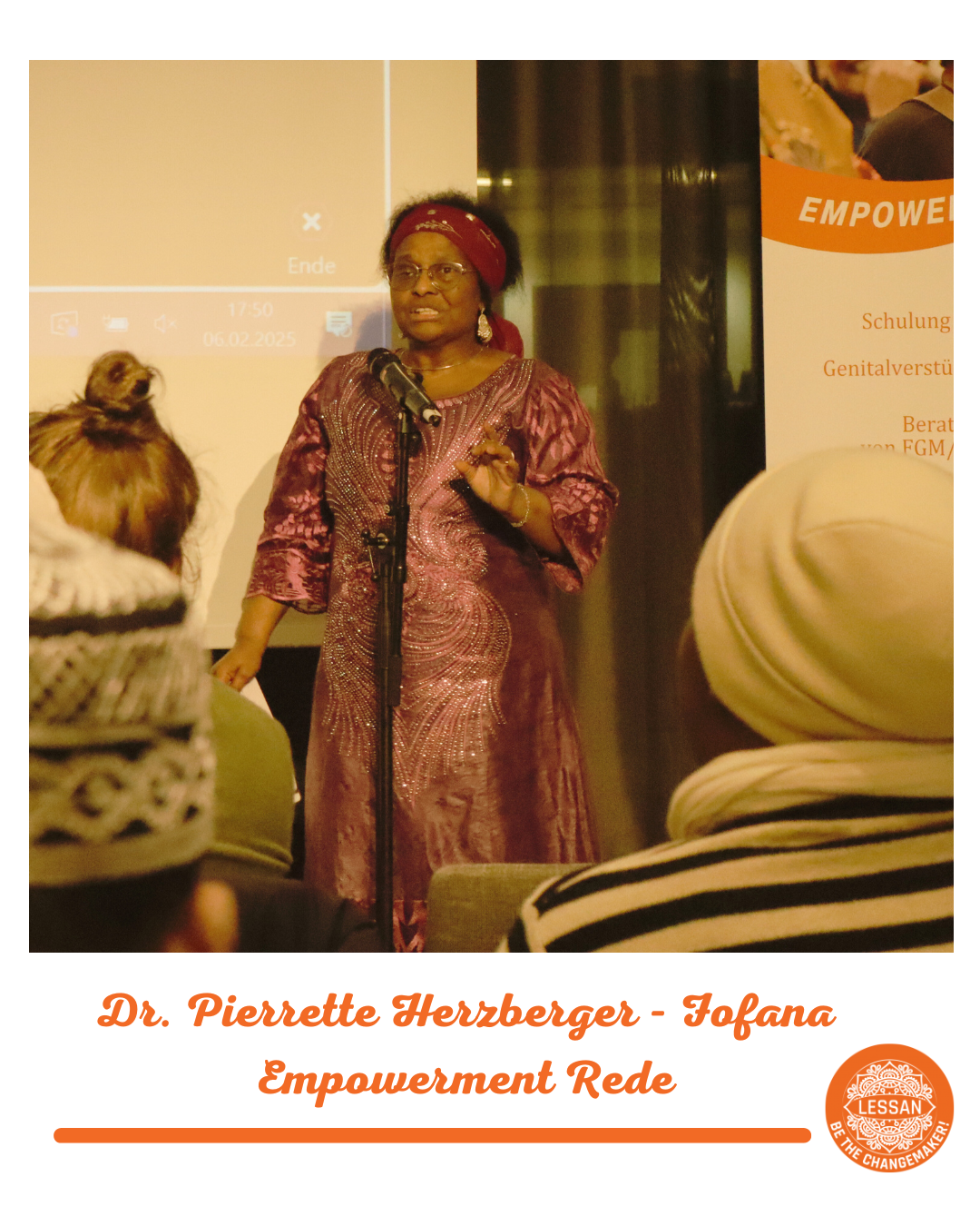 Es folgten Beiträge von Christelle Yobo und Dr. Pierette Herzberger-Fofane, welche die Bedeutung solcher Initiativen und deren Einfluss auf die betroffenen Zielgruppen hervorhoben. Ein besonderer Moment der Veranstaltung war die Ehrung von Dr. Gwladys Awo für ihr außergewöhnliches Engagement. Am 2. Dezember 2024 wurde sie vom Landesrat Hamburg mit dem Hammamonia Preis 2024 ausgezeichnet. Die Ehrung wurde von einer bewegenden Ansprache begleitet, die ihre Verdienste würdigte und die Relevanz der Auszeichnung sowie das Thema FGM/C und Frauen-Empowerment in den Vordergrund stellte.